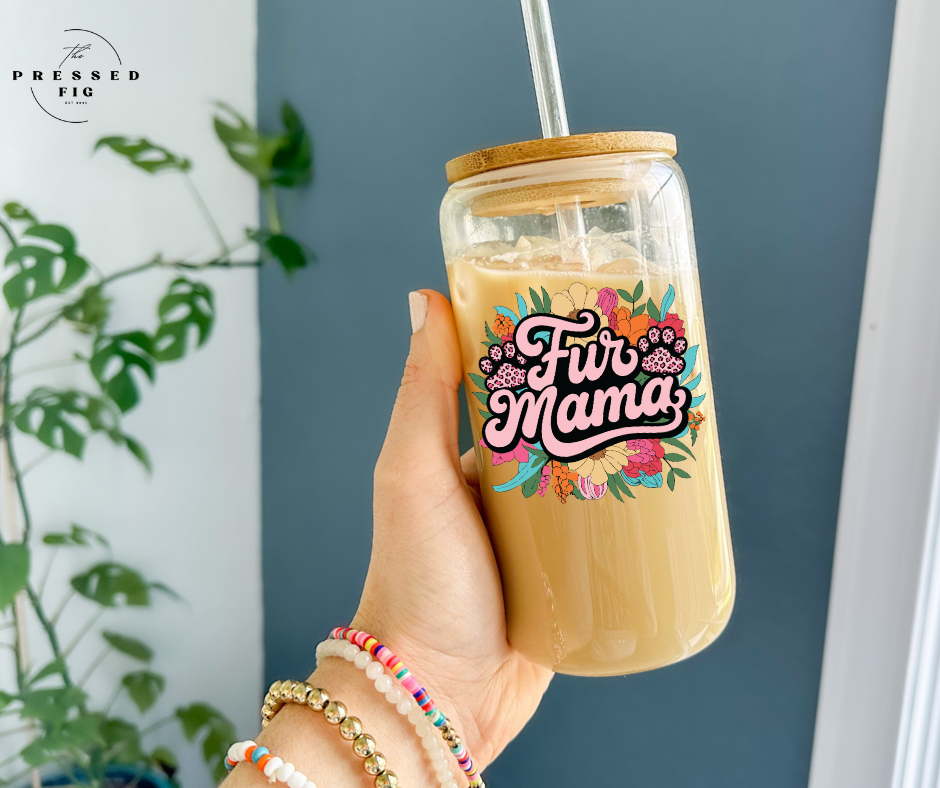 Bold, blooming, and made for the mamas who treat their fur babies like royalty. This cheerful glass features “Fur Mama” in a retro-style font surrounded by bright, floral pops and cheetah print paw accents for a fun twist. Choose between two sizes—16 oz or 40 oz—both perfect for iced coffee, lemon water, or whatever your current fave sip is. Comes with a bamboo lid and reusable glass straw.